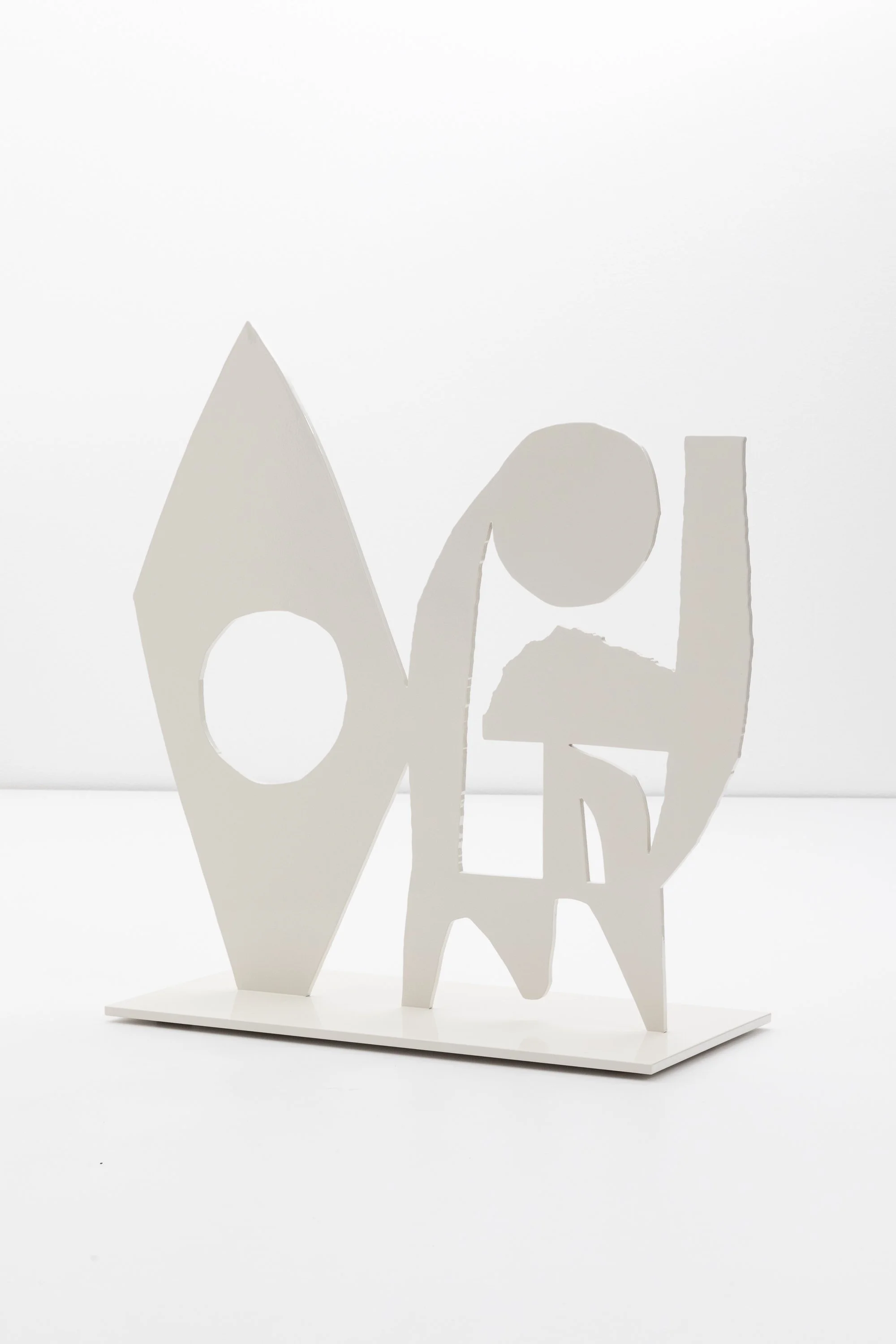 The exhibition marks Hudson’s first experiments with shaped panels, expanding the flat surface into more sculptural territory. This impulse carries through to the three aluminum sculptures on view, which echo forms found in his paintings, creating a visual dialogue of repetition across media. Several new works also employ internal repetition—images mirrored within themselves at smaller scales—suggesting cycles of time and the ebb and flow of contemporary life; “It’s with these I was thinking about time and space and the push and pull of the world we are living in,” Hudson explains.